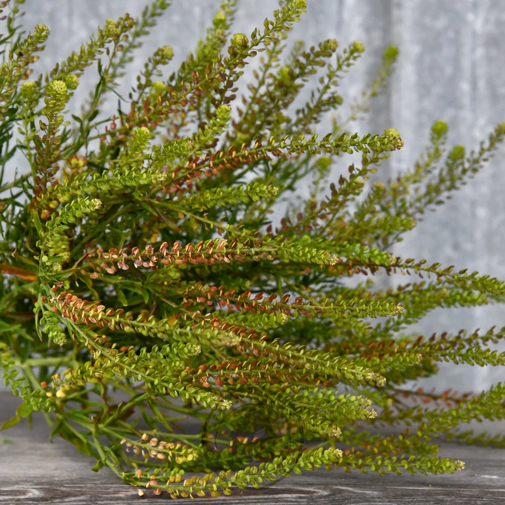 Very versatile filler with apple green stems and small, numerous seedpods on strong upright stems. The pods begin green and then develop a cranberry hint as they age drying a golden brown.