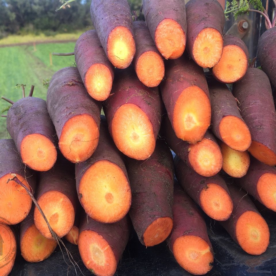 Vibrant magenta, purple skin with contrasting orange/yellow flesh with a sweet flavour and thin skin. Gourmet flavour in an attractive, vigorous growing, 15-17cm carrot. Stays sweet in the heat and holds well through the cold.