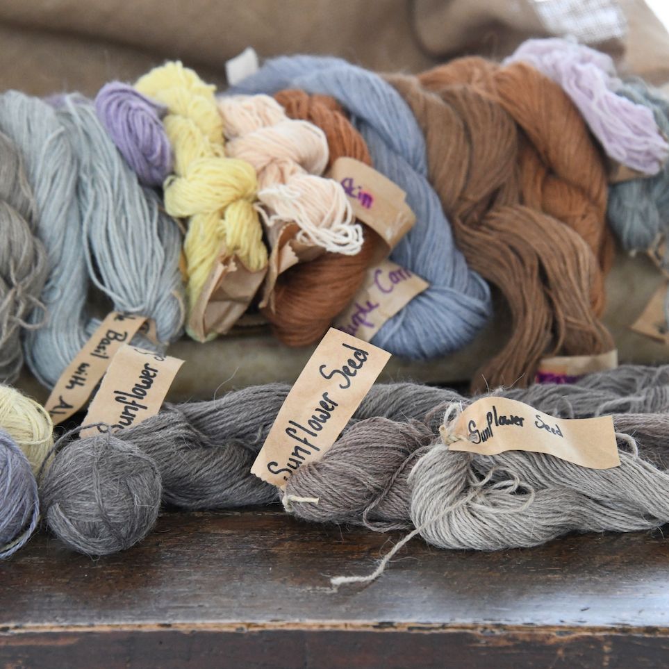 Dyeing: Dye colours derived from ‘Hopi Black Sunflower’ seeds, according to other sources, include maroon-red, deep maroon, dark purple, deep lavender, medium blue and black dye. In our experiments, the seeds have yielded gorgeous tones of grey pictured above. (Only the wool labeled is from sunflower seeds.) To begin the dyeing process, a dye stock liquid is made. To make this, add 2 liters of water to 300ml of seeds. Bring to the boil and gently simmer for ½ hour, or until the seeds split open. Strain through a cloth to obtain a deep maroon liquid. The dye stock liquid is the base to which mordants – different compounds that ‘fix’ the dye onto the material – are added.