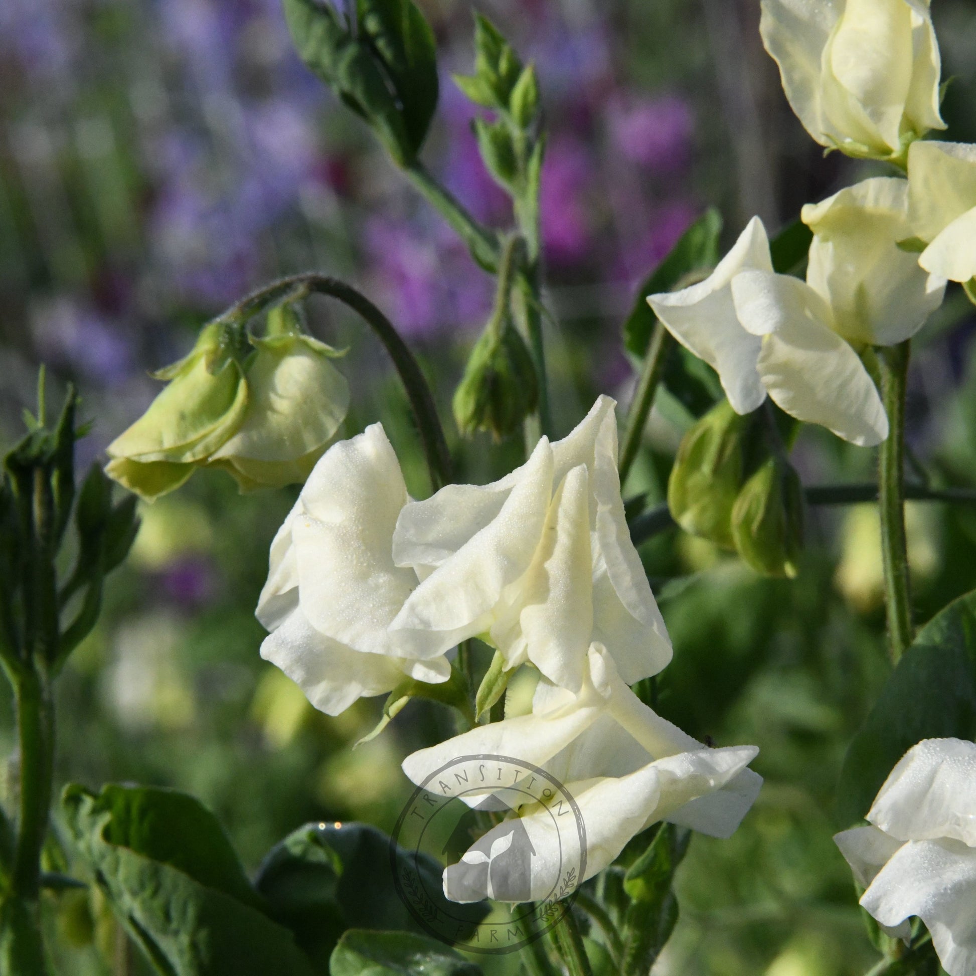 Heavily scented, prolific sweet pea with up to four gloriously frilly antique ivory large, fragrant flowers on each stems. Great variety for “cutting on the vine”.